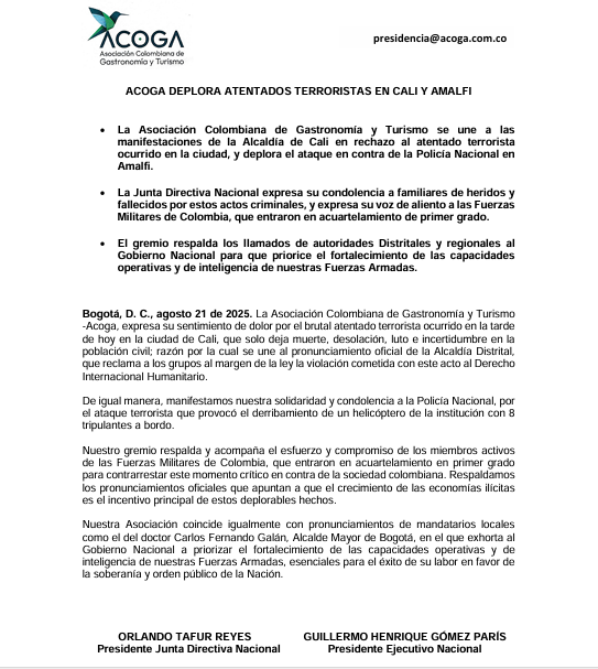 Guillermo Henrique Gómez Paris, presidente ejecutivo nacional de Acoga, emitió un comunicado en la noche de hoy, expresando el sentimiento de dolor de la agremiación por el brutal atentado terrorista ocurrido en la tarde de hoy en la ciudad de Cali, "que solo deja muerte, desolación, luto e incertidumbre en la población civil".